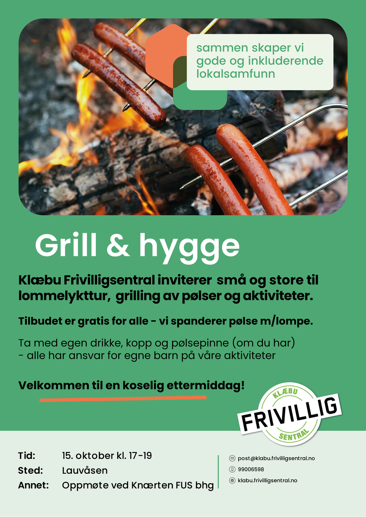 Klæbu Frivilligsentral inviterer små og store til lommelykttur, grilling av pølser og aktiviteter.Tilbudet er gratis for alle - vi spanderer pølse m/lompe.